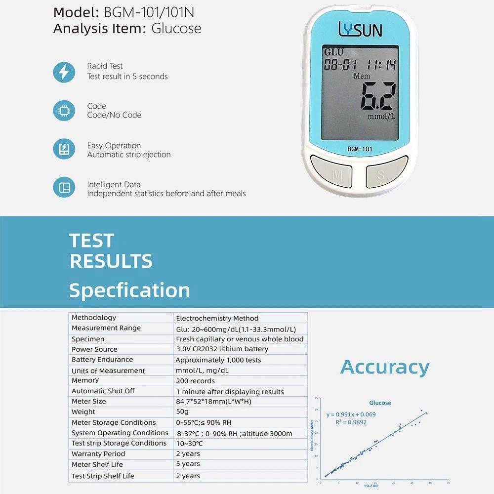 Fitur Utama Sistem Pemantauan Glukosa Darah• Strip uji yang dirancang dengan siphon pra-hisap, mudah dan nyaman digunakan• 1μL sampel darah kecil• Waktu pengukuran cepat 5-detik• LCD besar yang mudah dibaca• Otomatis 7, 14 & 28 hari rata-rata• Menyimpan hingga 200 hasil dengan tanggal dan waktu
